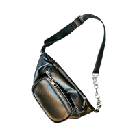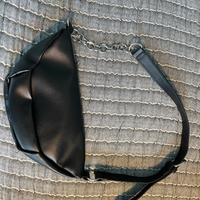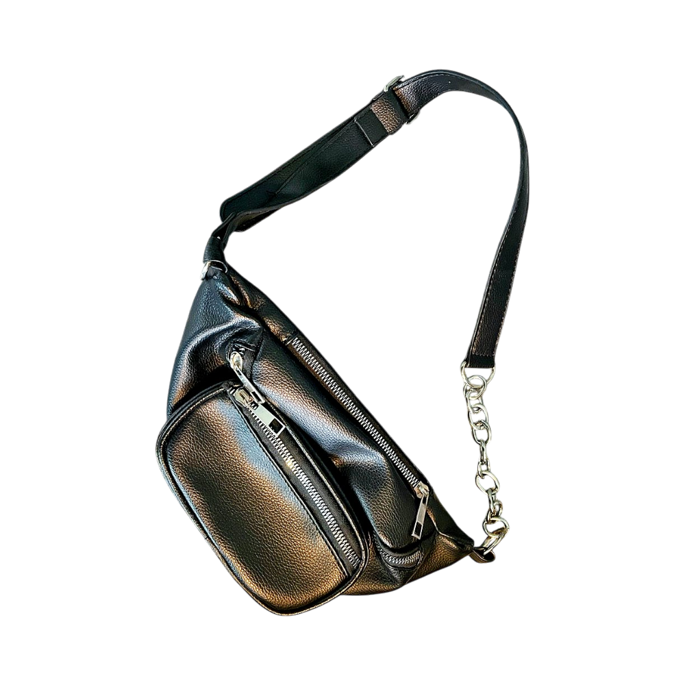 Black leather waist bag with silver zippers and chain detail