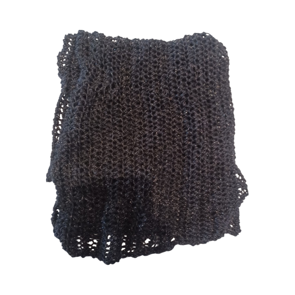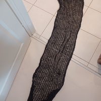 Pitkä, ilmava virkattu huivi hopeisilla kimaltavilla langoilla. Kerran pidetty.