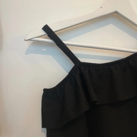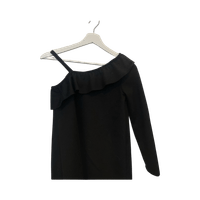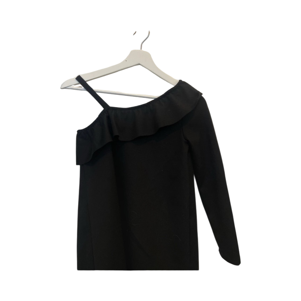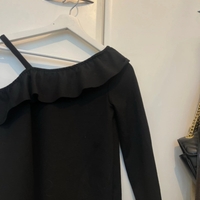 Musta off-shoulder paita, frilliyksityiskohta, pitkä hiha.