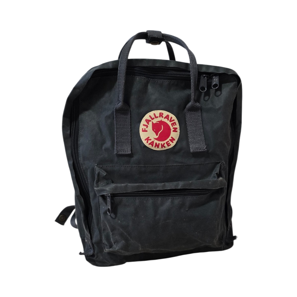 Klassinen Fjällräven Kånken -reppu. Reppu on ollut käytössä ja siinä on jonkin verran ajan tuomaa kulumaa, mutta kaikki vetoketjut ja hihnat toimivat moitteettomasti. Mukana tulee alkuperäinen istuinalusta.