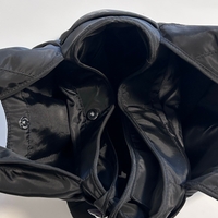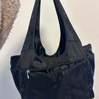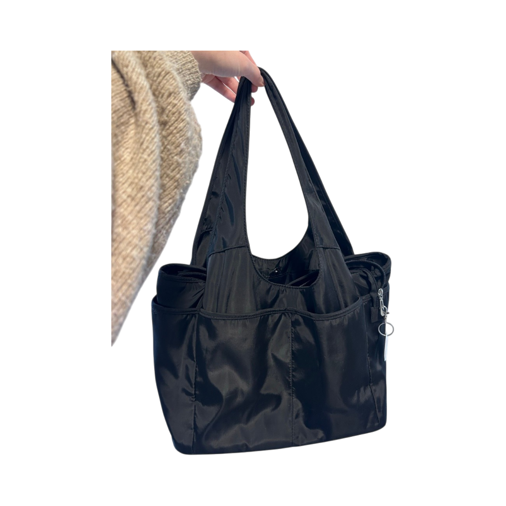 Spacious black tote with multiple exterior pockets and zippered compartments.