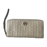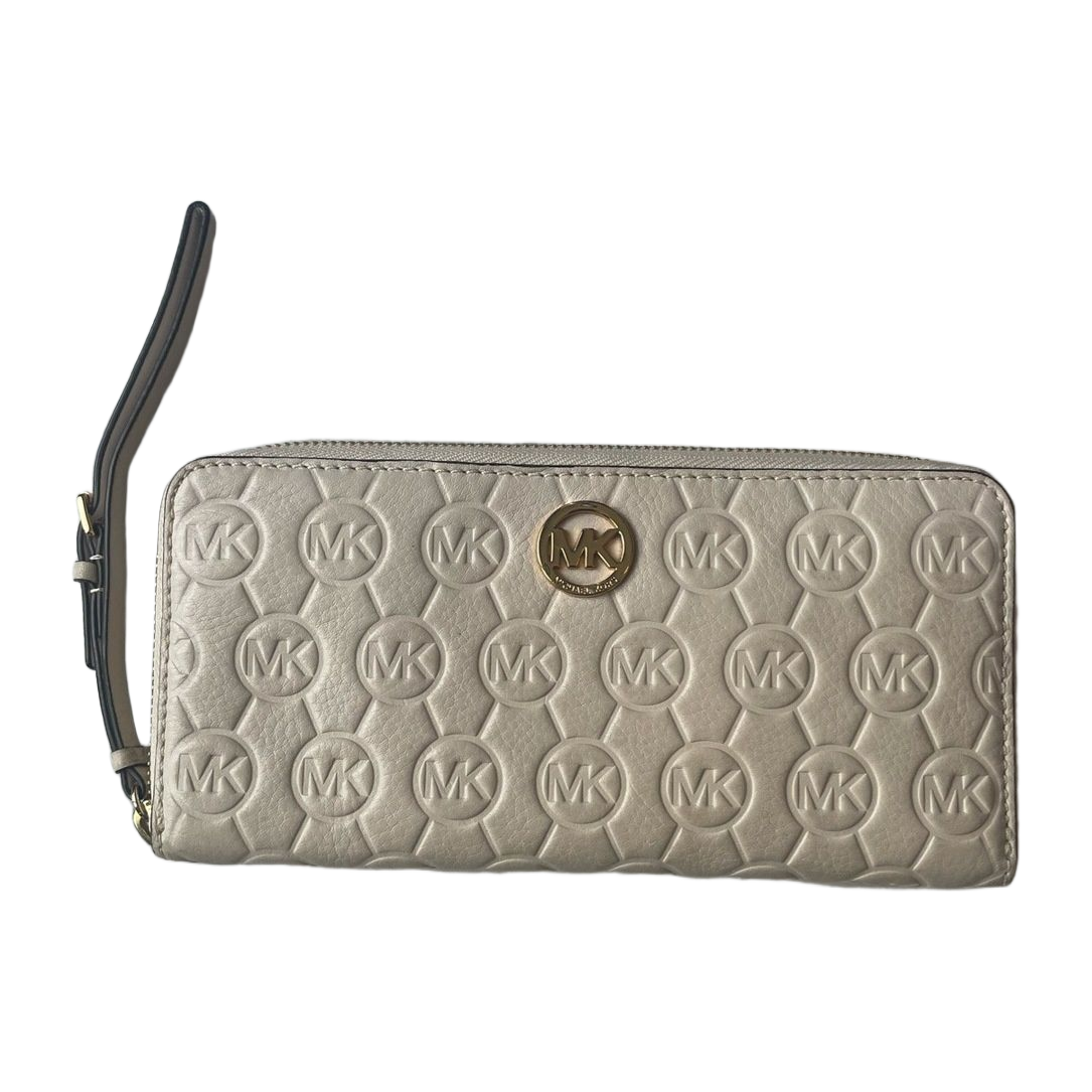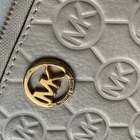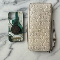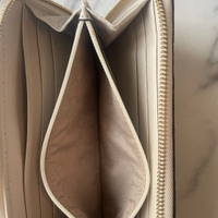 Norsunluun värinen/luonnonvalkea nahkainen Michael Kors kukkaro monogram kuosilla. Todella vähän käytetty, ei käytönjälkeä nahkassa tai vuoressa. Metallisessa koristelogossa (näkyy viimeisessä kuvassa) pientä kulumaa. Kolmannessa kuvassa iPhone12 minin kuori antamassa kokoluokkaa, mahtuu siis hyvin puhelinkin sisälle, voi käyttää pienenä laukkuna.