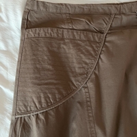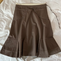 Ruskea midipituinen puolikellomallunen hame, taskuilla.