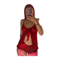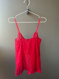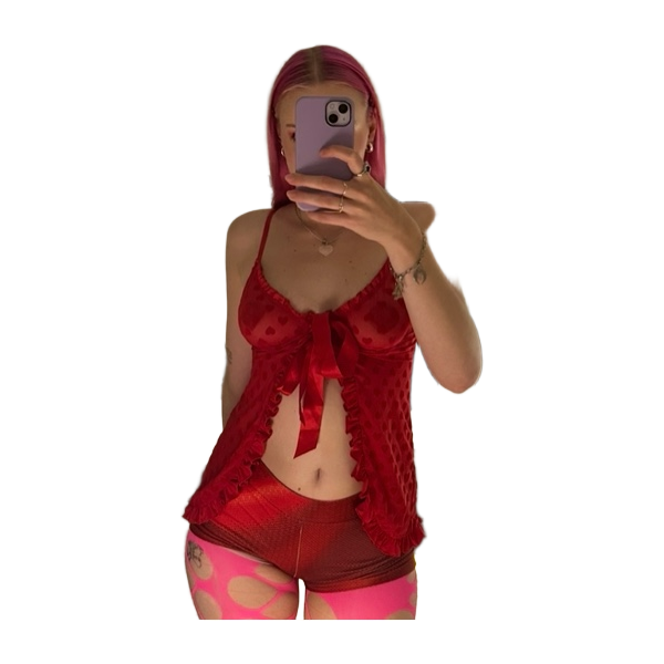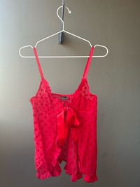 Punainen babydoll toppi, jossa säädettävät olkaimet. Edessä on sidottava rusetti ja kuviona pieniä sydämiä <3 Ei kokolappua mutta sopii S/M-kokoiselle :)