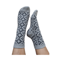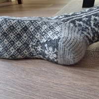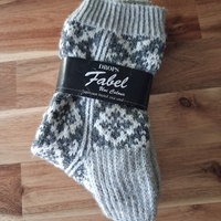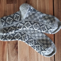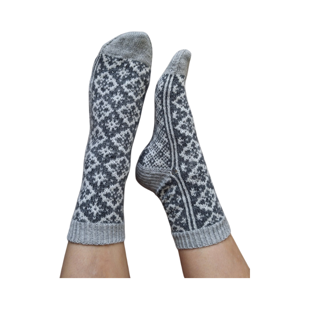 Kösin neulotut harmaakuvioiset kirjoneule villasukat, koko noin 38-40. Villaa, merinovillaa ja polyamidia. Varren pituus noin 13 cm, leveys 9,5 cm, pohjan pituus noin 23,5 cm.