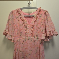 Vaaleanpunainen kukkamekko röyhelöillä ja lyhyillä hihoilla. 🌸 Kerran Käytetty ja erinomaisessa kunnossa.