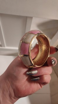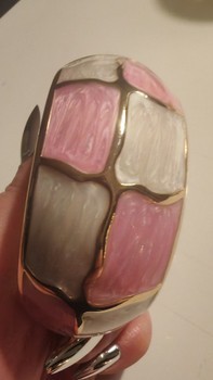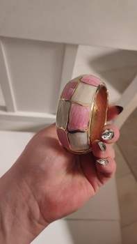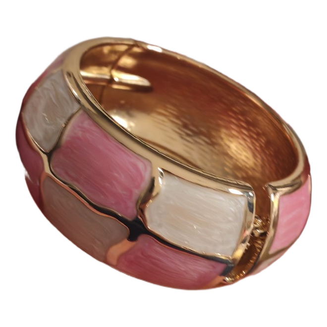Kultasävyinen saranoitu rannerengas, jossa vaaleanpunaisia ja vaaleita ruutuja.