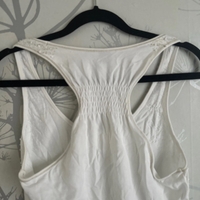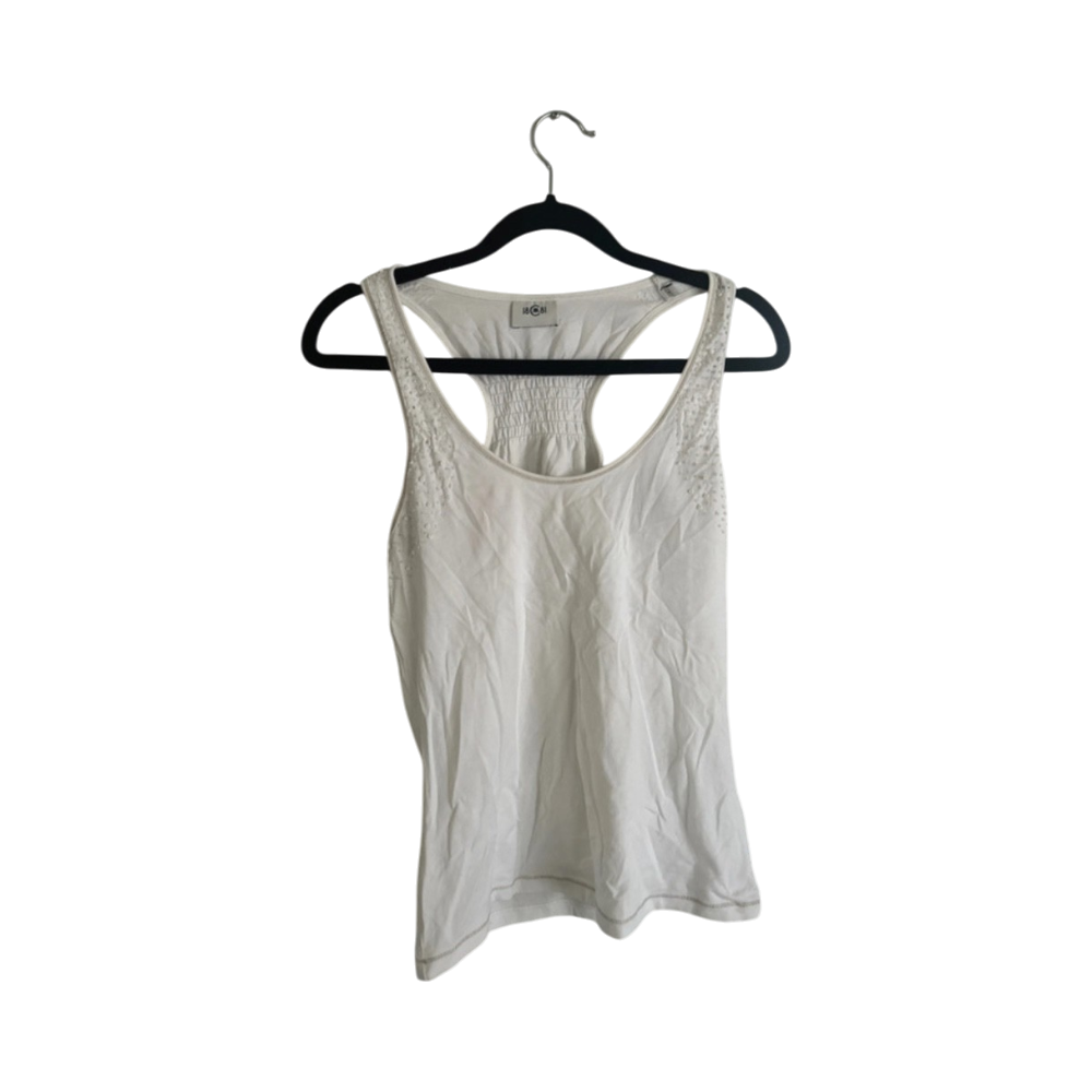 White racerback tank top with beaded shoulder details.