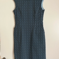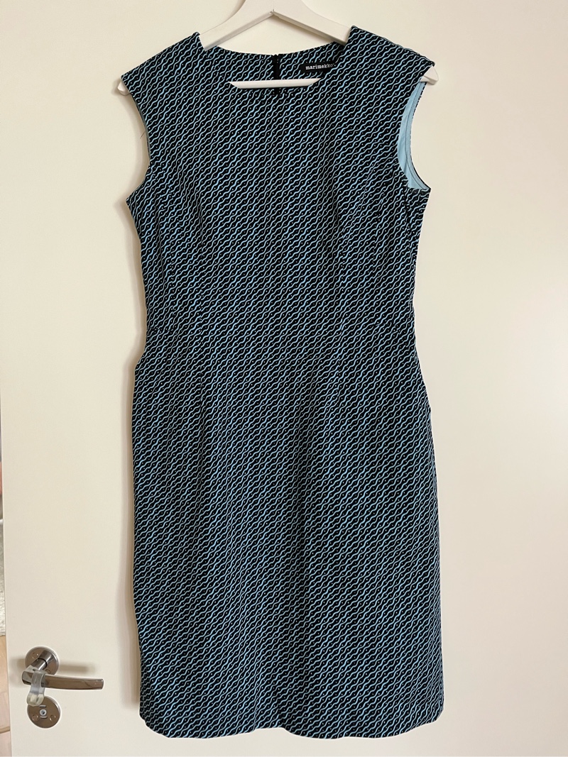 Marimekon hihaton mekko, takana vetoketju. Väri vaaleansininen/turkoosi ja musta. Puuvillaa, vuorillinen. Taskut. Mallin nimi Rahina. Koko 34, kai-kai 42 cm. Kainaloissa pientä käytön jälkeä.
