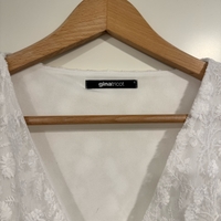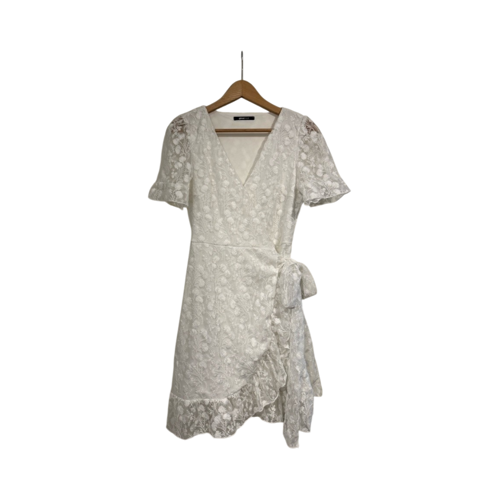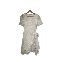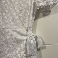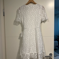Lyhyt valkoinen pitsimekko, kietaisumallisella vyöllä