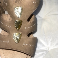 Ruskeat sandaalit koristekivillä, säädettävä remmi. Kengissä on pientä kulumaa.