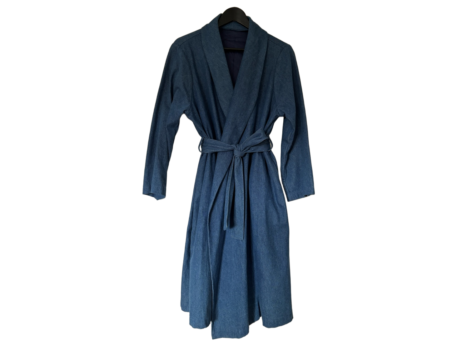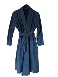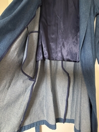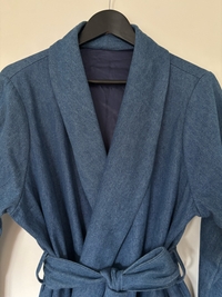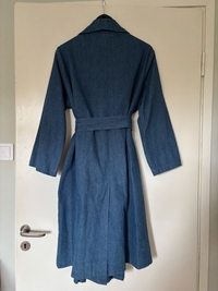 Sininen kietaisumallinen farkkutakki vyöllä. Self made, ostettu käytettynä, erittäin hyvässä kunnossa ja hienoa viimeistelytyötä. Laadukas takki! Ei kokomerkintää, mutta arvioisin, että menee joustavasti koolle 38-42.