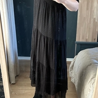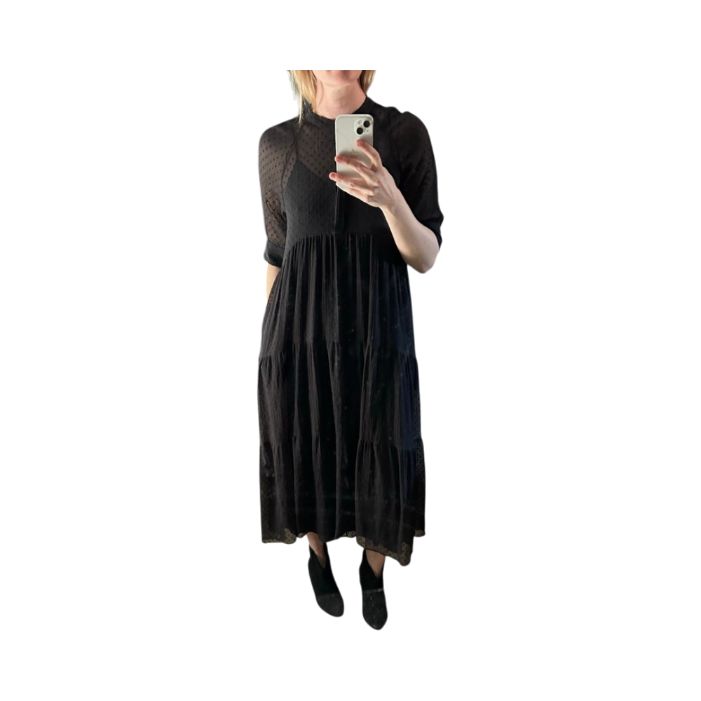 Musta polkadot-mekko, kerroksellinen ja läpikuultava yläosa.