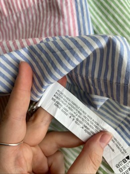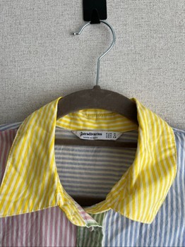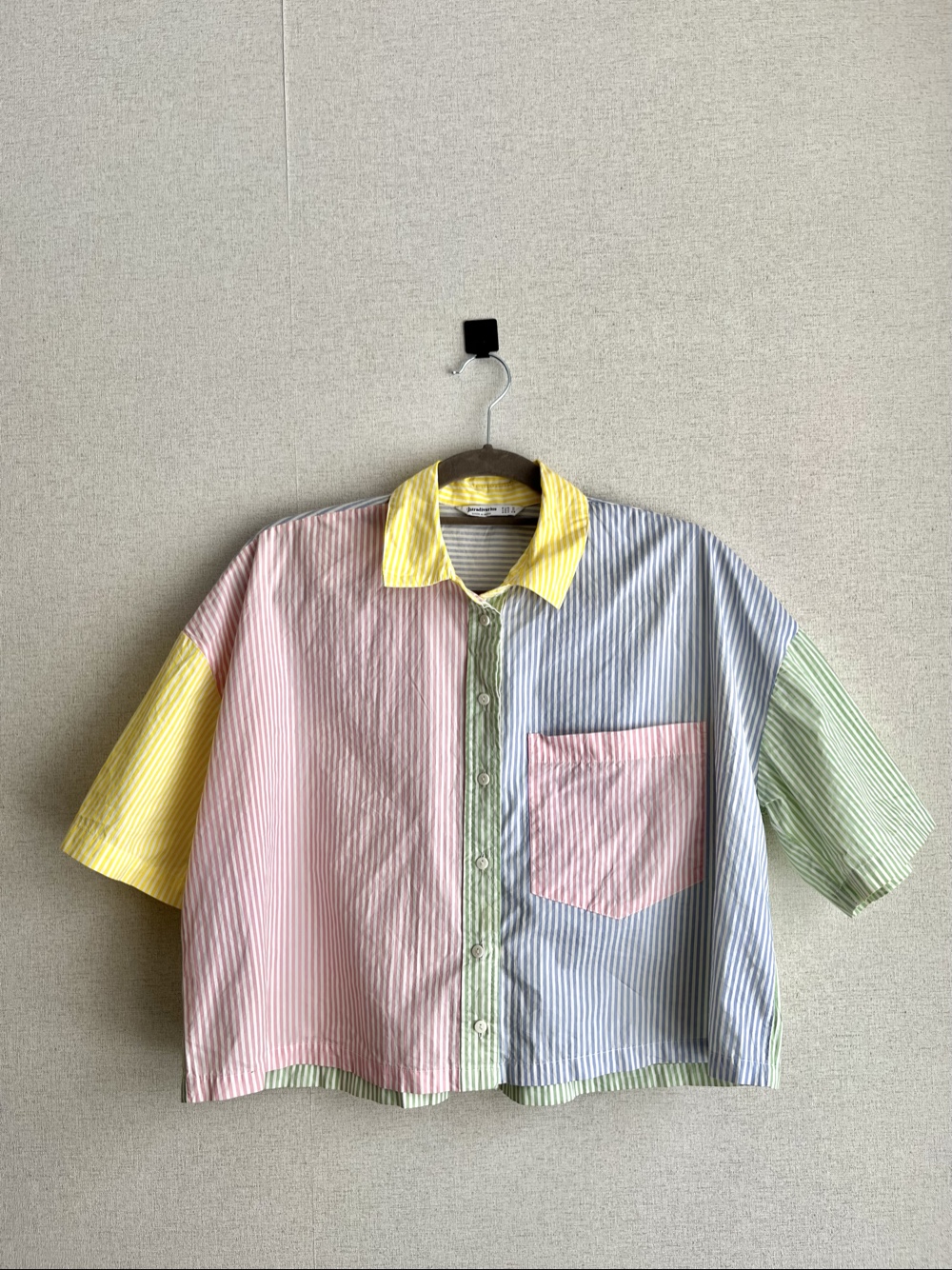 Short-sleeved shirt with a multicolor striped pattern. Features a chest pocket and button-down front. Made of 100% cotton.