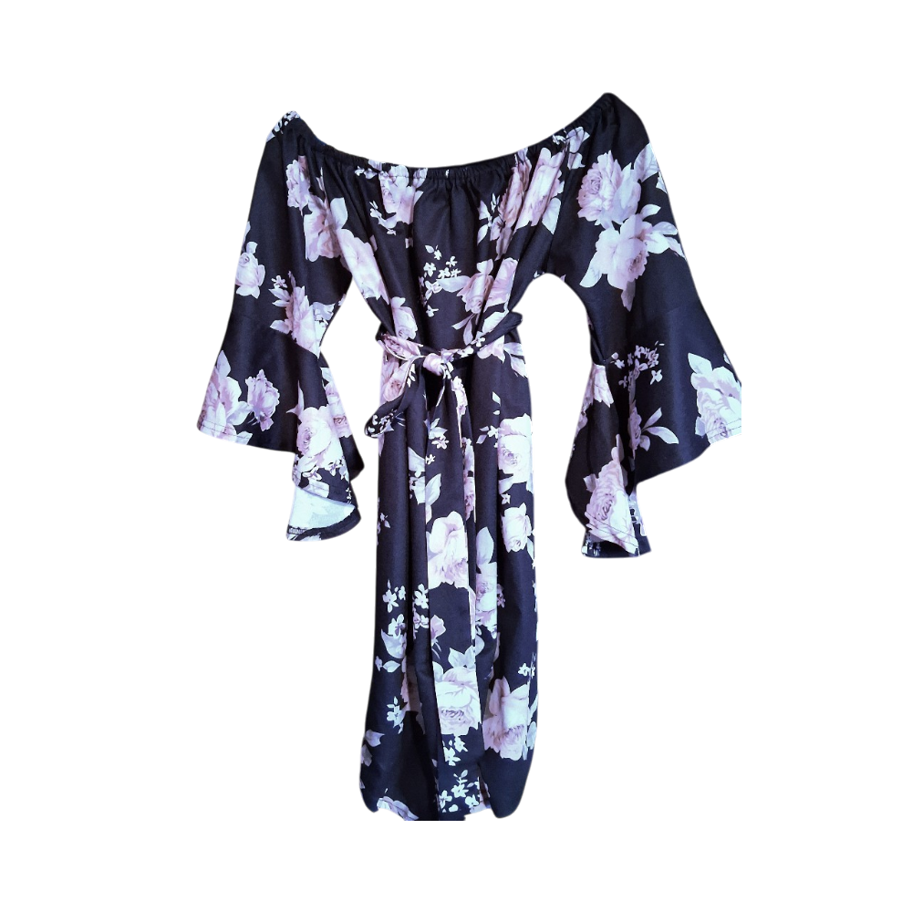 Off-shoulder mekko, kukkakuosi, vyö ja holkkihihat/röyhelö