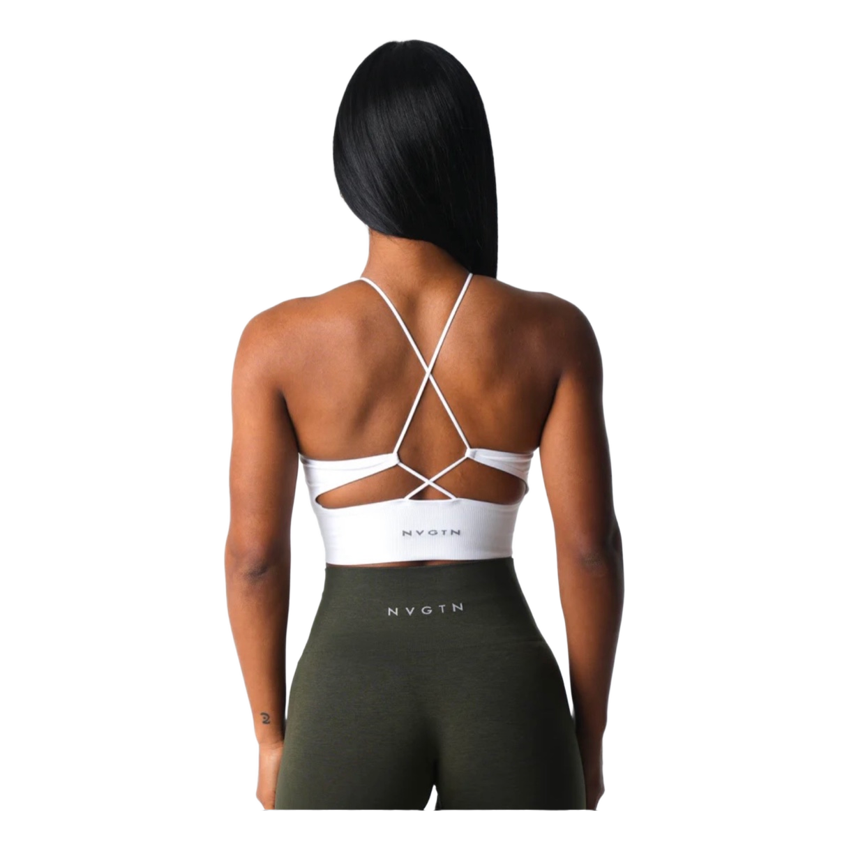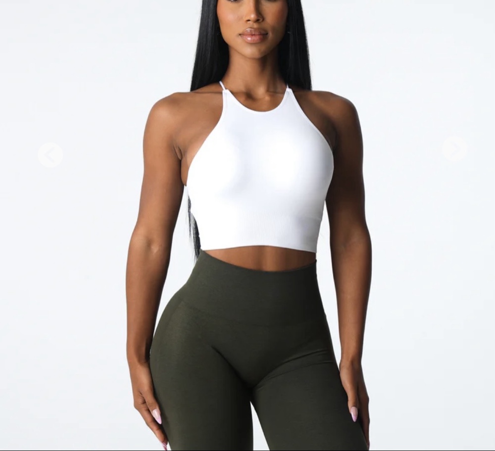 Valkoinen, selästä ristikkäismallinen urheilutoppi.