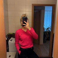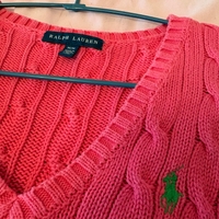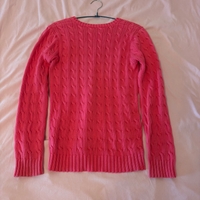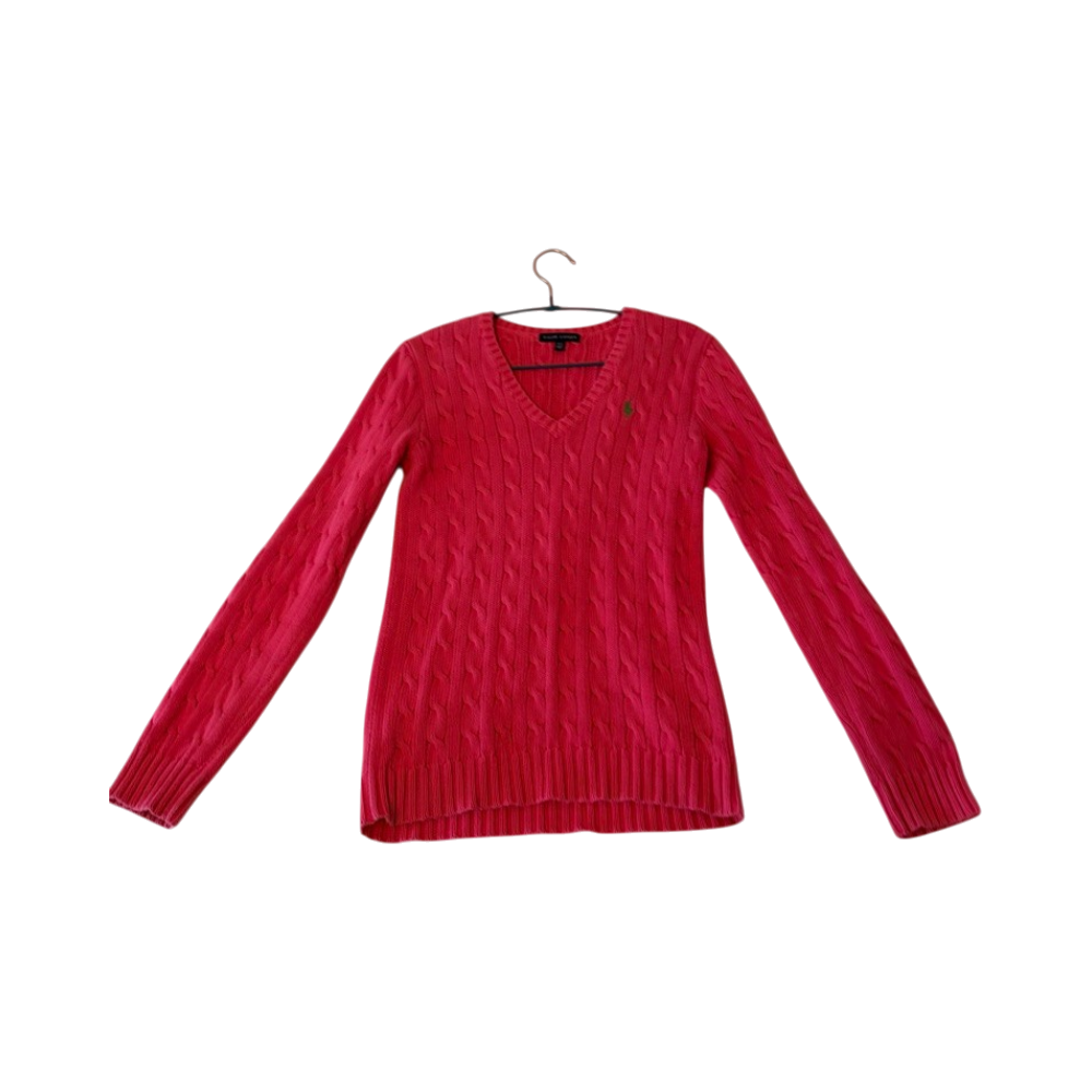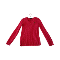 V-neck cable knit sweater with embroidered logo, casual wear.