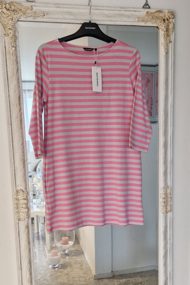 Marimekko uusi Peretta Tasaraita taskullinen puuvillatunika, S. Raidat vaaleaharmaa ja pinkki. Ostin näitä joka värissä ja tämä on jäänyt käyttämättä.