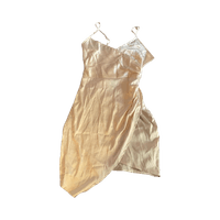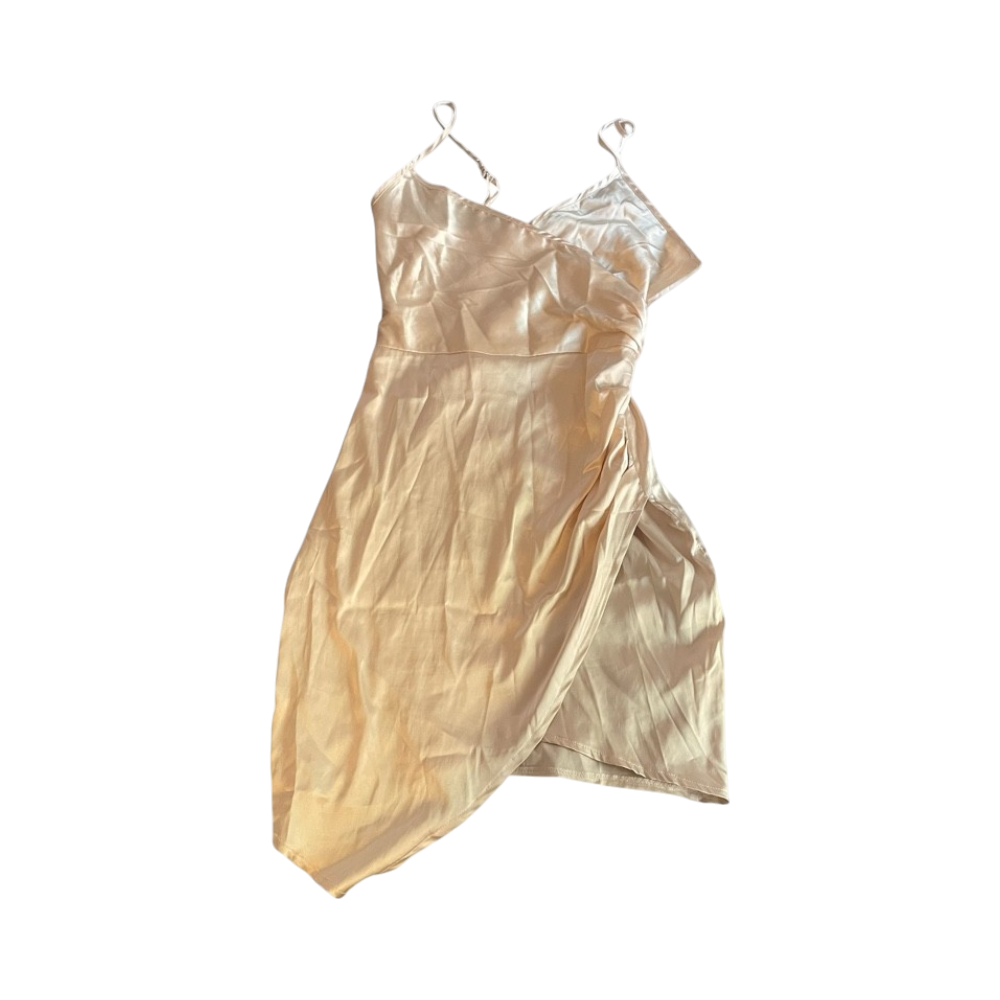 Beige hihaton slip-mekko, olkaimet ja kiiltävä pinta.