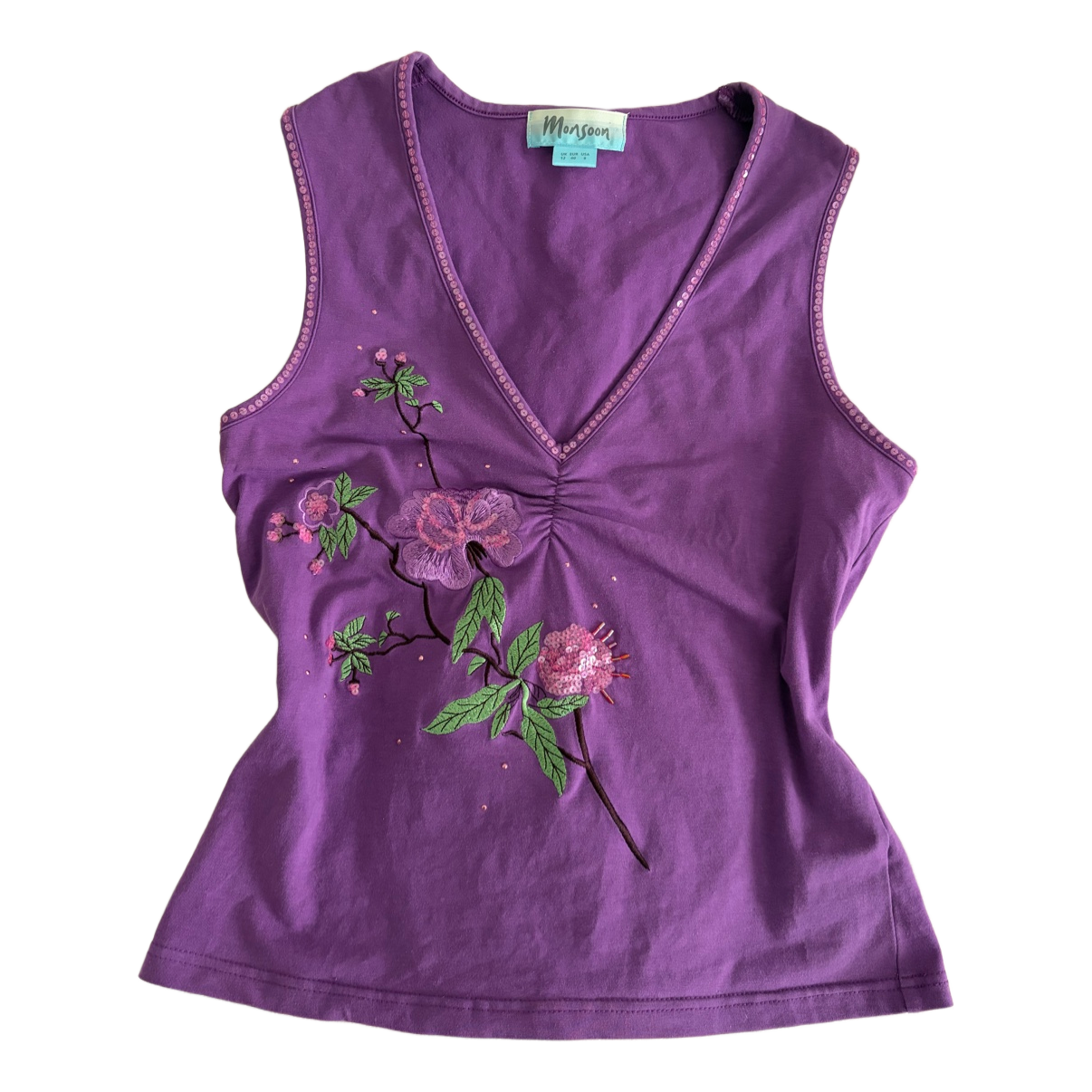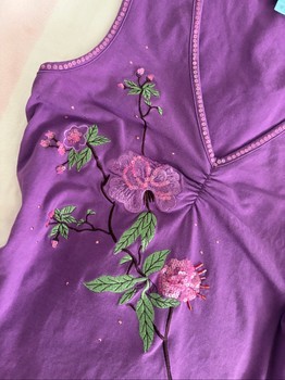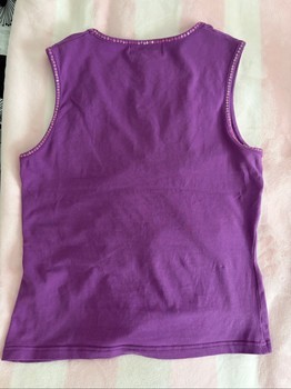 Purple sleeveless top with floral embroidery and sequin embellishments. Features a V-neckline and a cotton-elastane blend. Size 40.