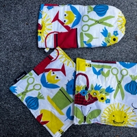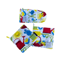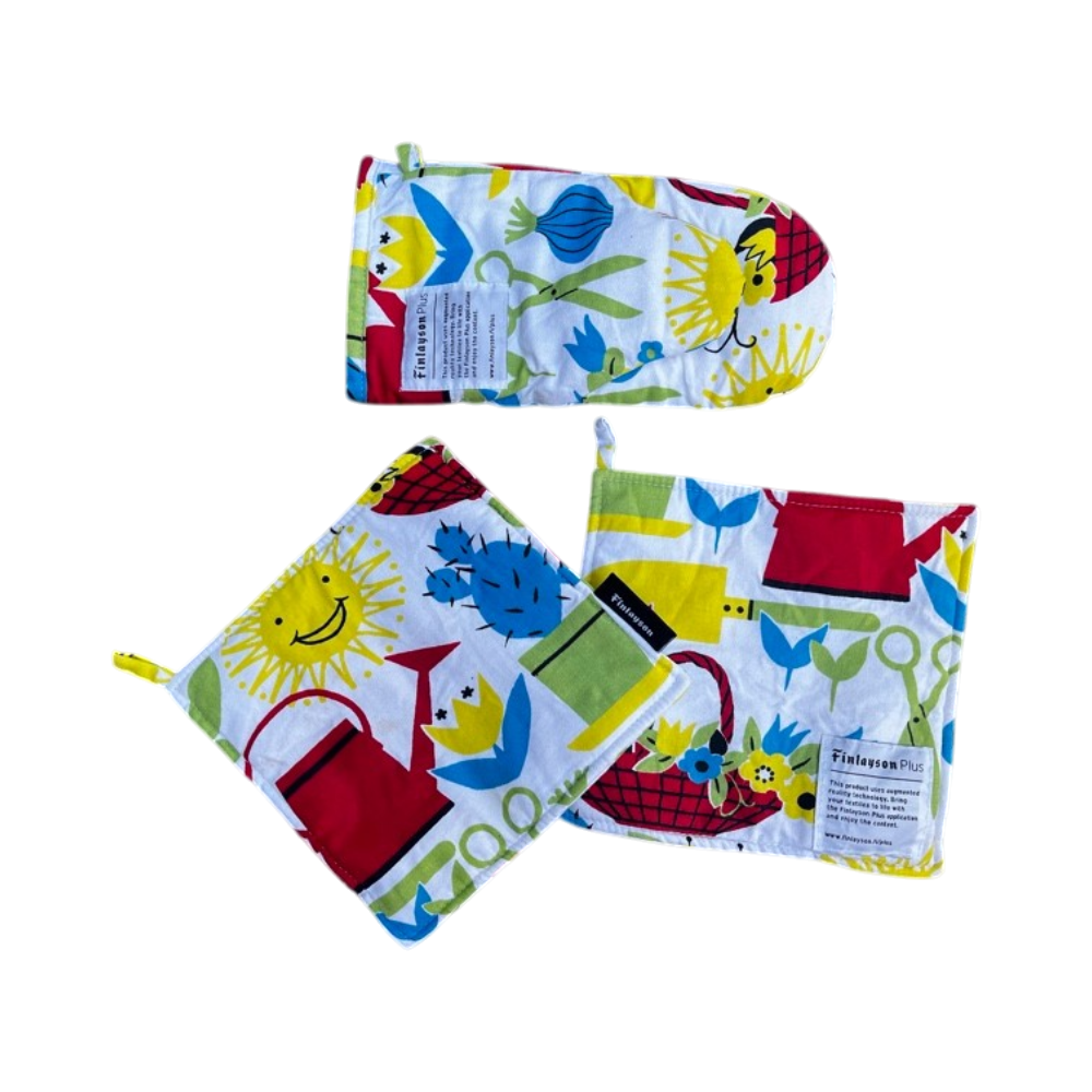 Setti: 2 patalappua ja 1 patakinnas, Puutarha-kangasta. Ollut hyvin vähällä käytöllä