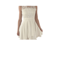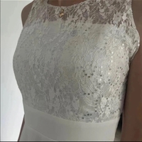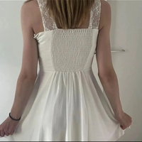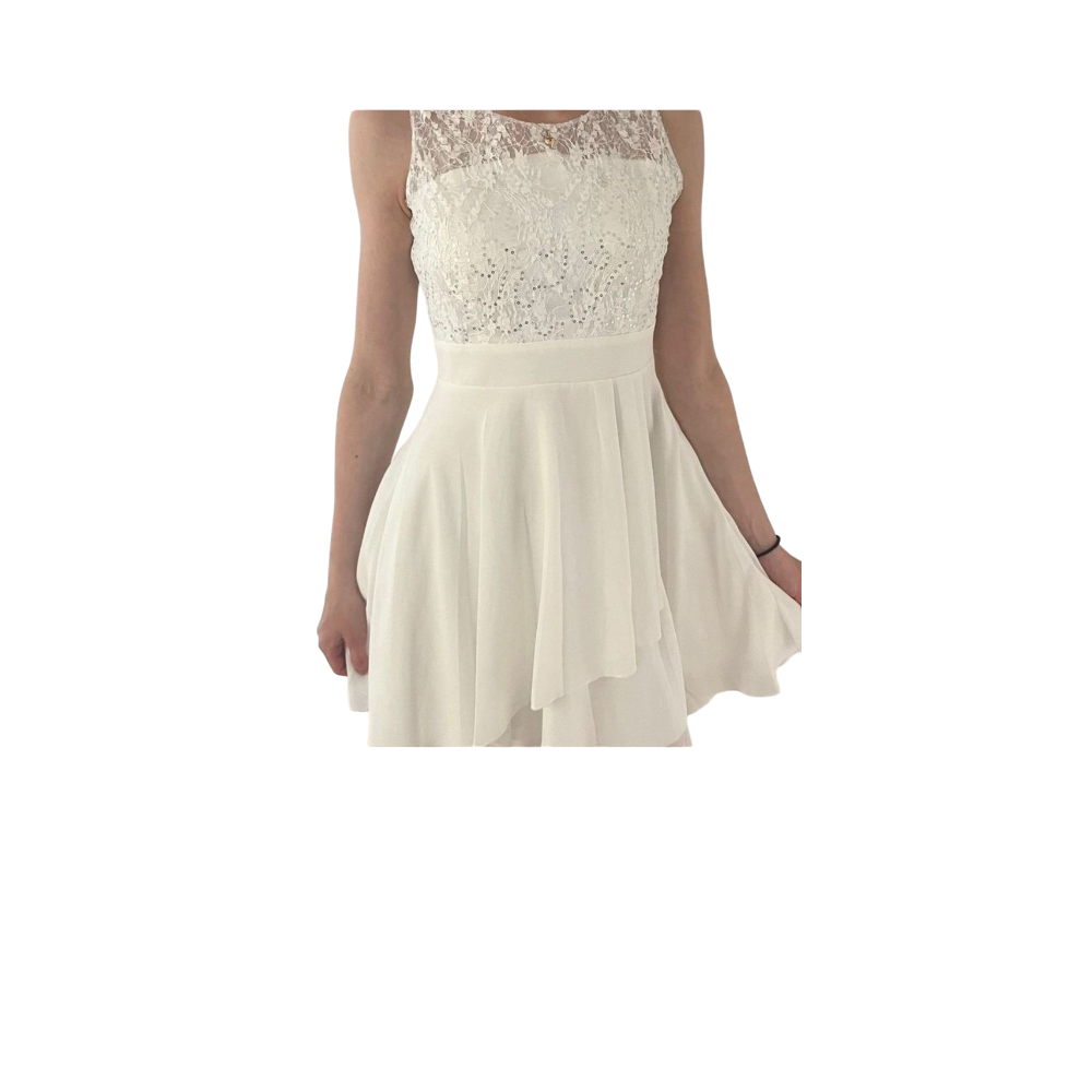 Lyhyt valkoinen morsiustyyli mekko pitsiyläosalla. Koko 146 mutta menee myös 152 kokoiselle. Eintojen kohalla kevyet toppaukset