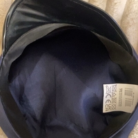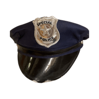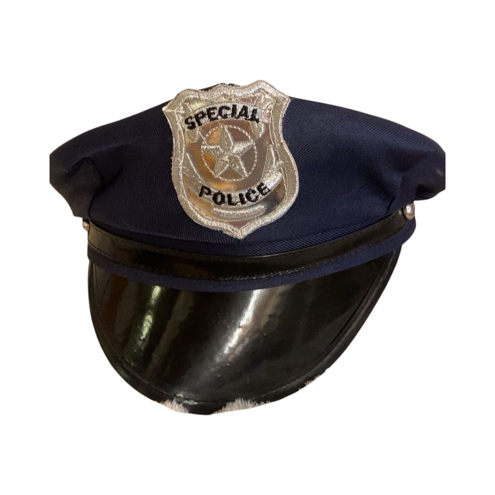 Tummansininen poliisihattu muovisella lieriellä ja säädettävällä takakiinnityksellä.