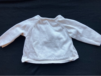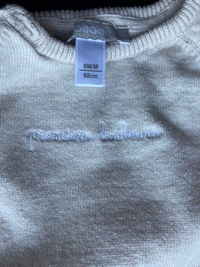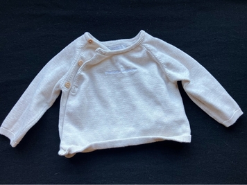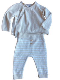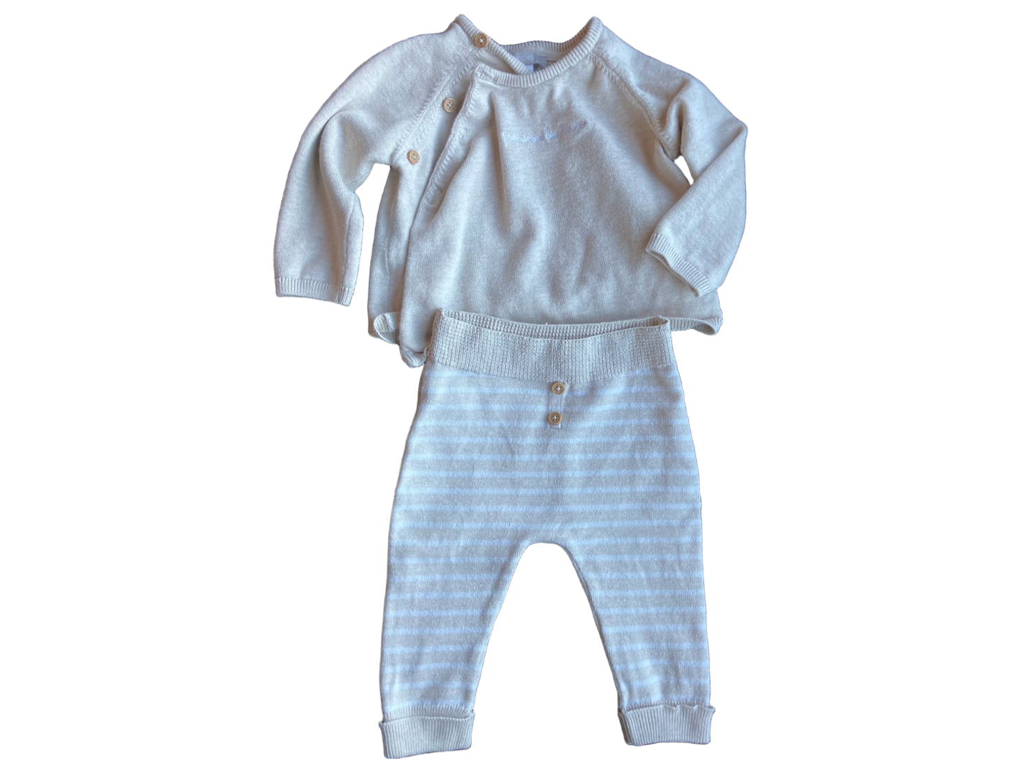 Beige neulepaita ja raidalliset housut vauvalle, koko 3-6 kk, puuvillaa, merkki Obaïbi. Ostettu uutena Ranskasta ja käytetty yhdellä lapsella. Hajusteettomasti pesty.