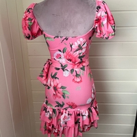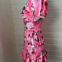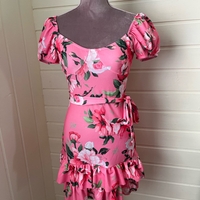 Pink floral mini dress with puff sleeves, ruffle hem, and removable belt.