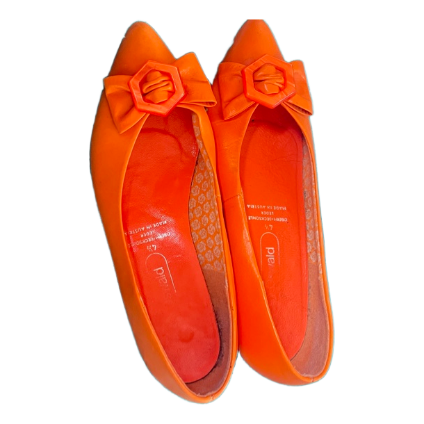 Orange leather ballet flats with decorative bow details and geometric accents. Size 4.5, made in Austria.