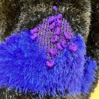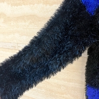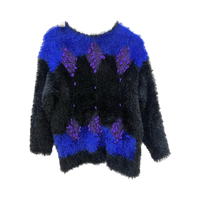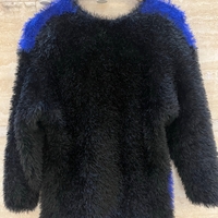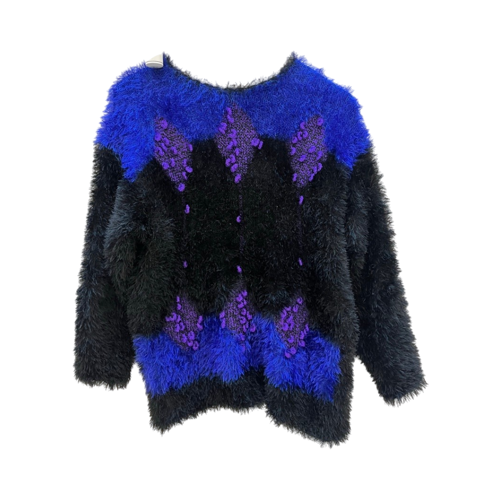 Pehmeä, karvainen neulepusero sinisillä ja violeteilla yksityiskohdilla. Koko S-M