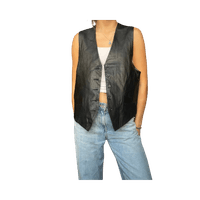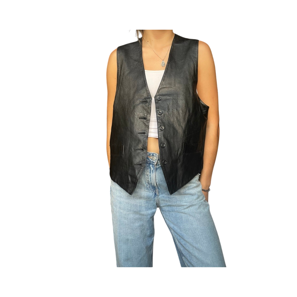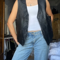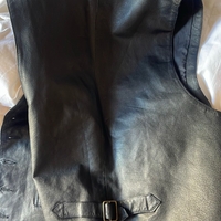 vintage black leather vest / Aitoa nahkaa, musta liivi vyöllä takana.