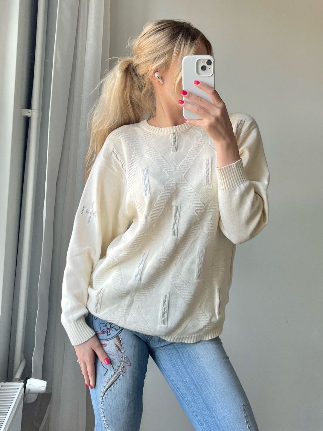 Todella hyvässä kunnossa oleva vaalea neule🩵 Neuleessa on kauniit kuviot edessä. Mukava päällä, ei kutita tai ole nukkaa. Sopii S-M kokoiselle. 100% puuvillaa.