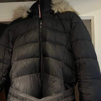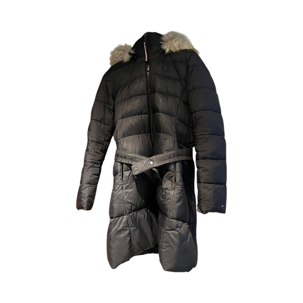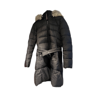Pitkä toppatakki irrotettavalla hupulla ja vyöllä, lämmin. ❤️ Vähän meikkivoidetahraa kauluksessa, en ole kokeillut pestä vielä pois. Kokoa l, istuu paremmin m.