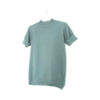 Turquoise/blue short-sleeved turtleneck knit. Generally good condition, but slightly fuzzy. No size tag, best fits extra small to small.