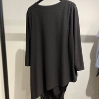 Musta tunika/mekko paljeteilla. Päällysosan alta tulee kapea mekko, jossa on rypytykset sivuilla. Voi pitää mekko mitassa tai nostaa tunika mittaan. Koko Ger 42.
