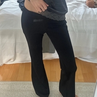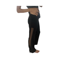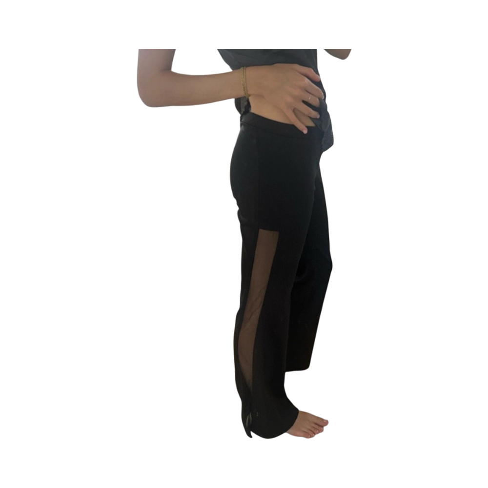 Black wide-leg trousers with sheer side panels, relaxed fit.