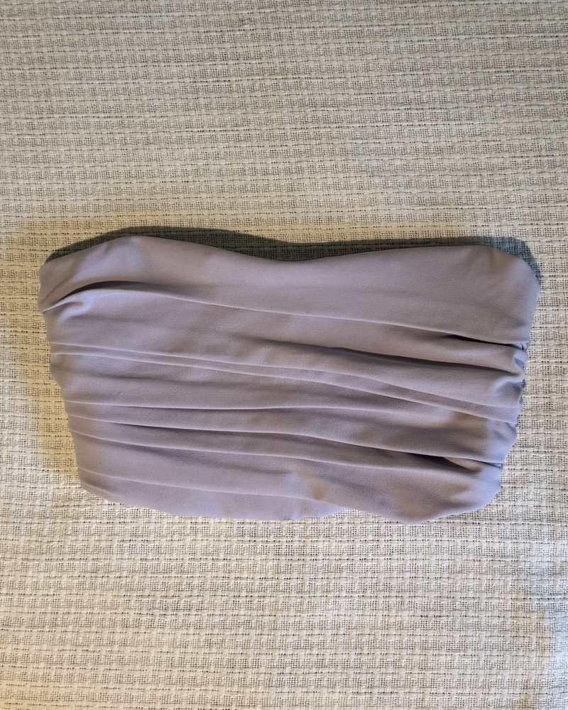 Kerran käytössä ollut bandeau-mallinen cropattu toppi. Sivussa piilovetoketju.