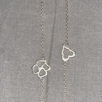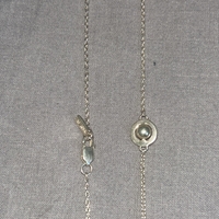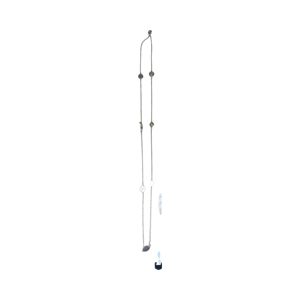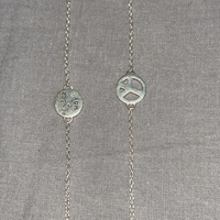 Pitkä hopeanvärinen kaulaketju koristeellisilla riipuksilla.