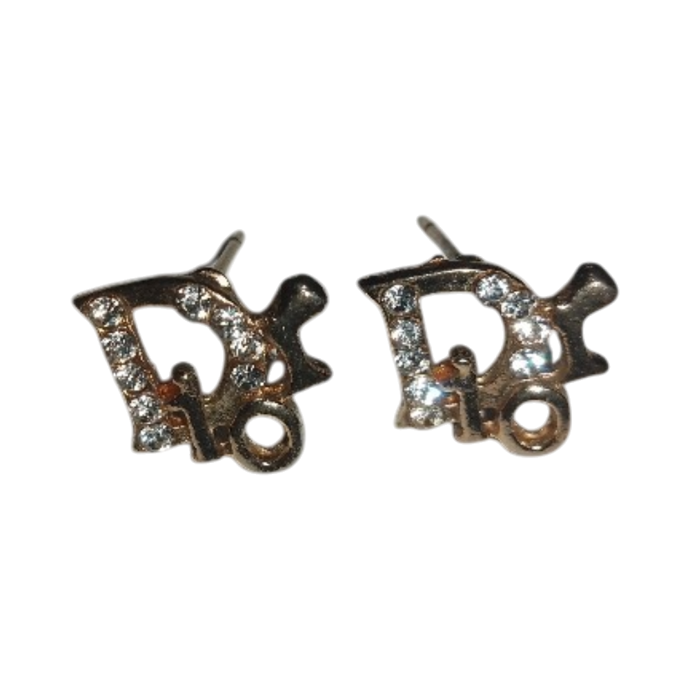 Gold-tone D initial stud earrings with clear crystals, small size.