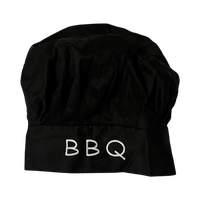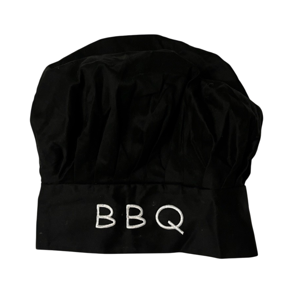 Musta kokkihattu, teksti 'BBQ', tarrakiinnitys takana.