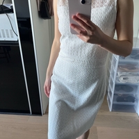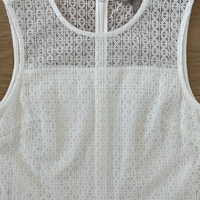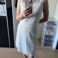 Elegant white sleeveless dress with lace pattern and fitted waist.