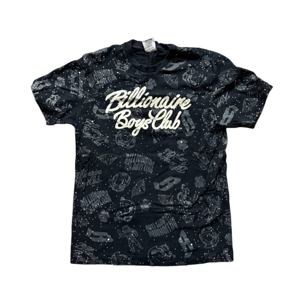 Musta printtipaita, iso logo edessä, rento unisex-tyyli.