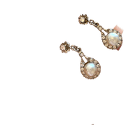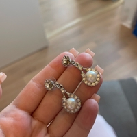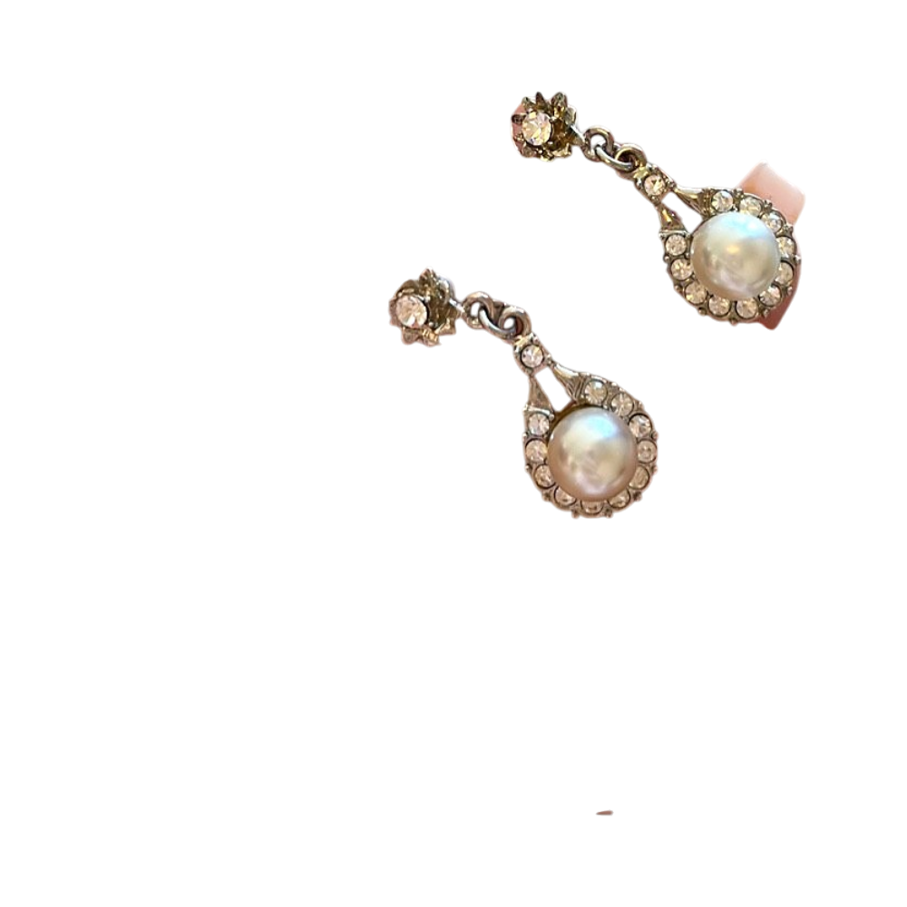 Elegant silver-tone earrings with pearl and rhinestone details.