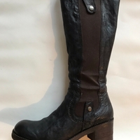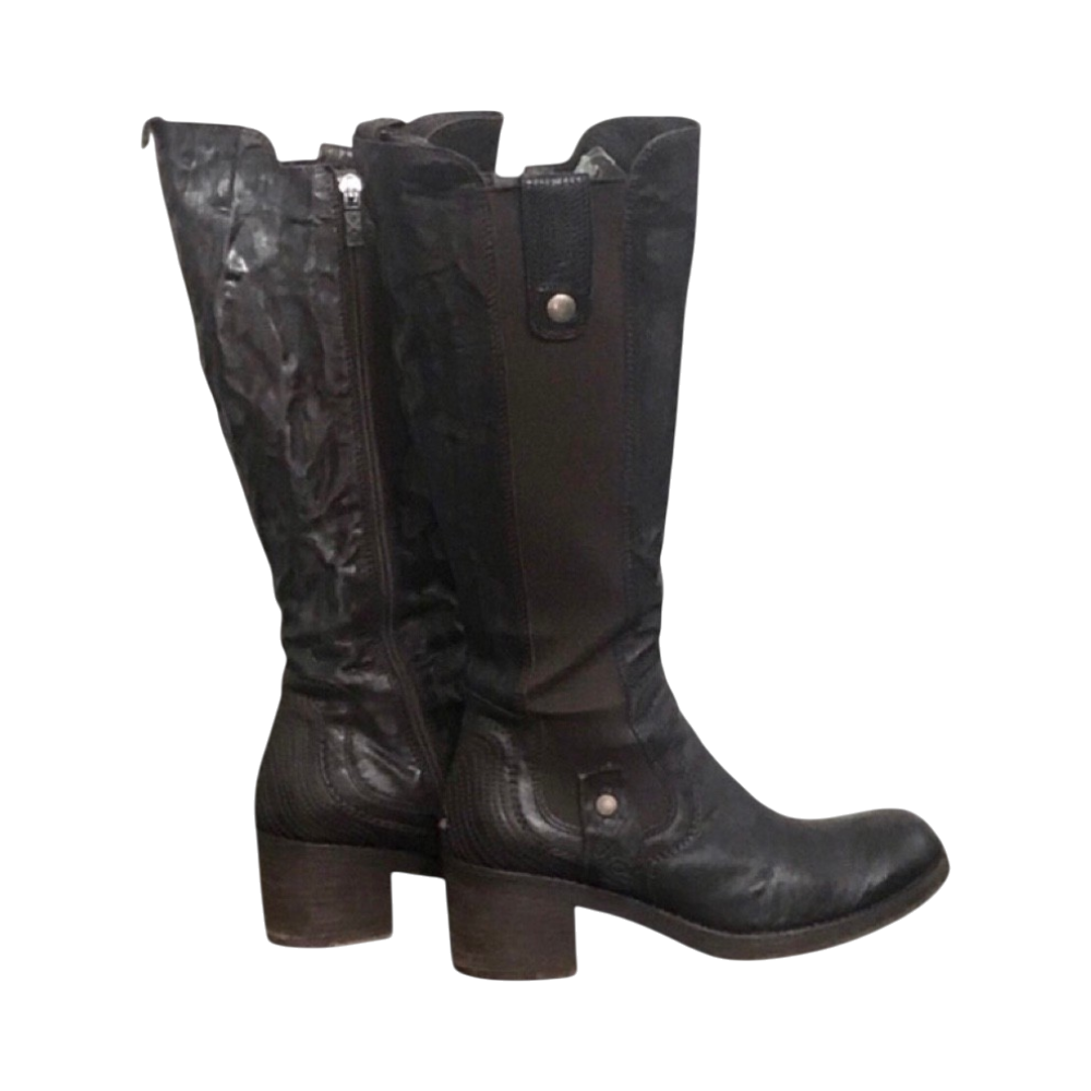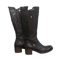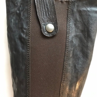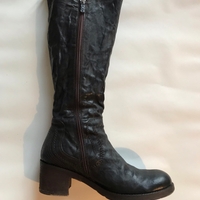 Tummanruskeat saappaat antiikkinahkaa. Ympärysmitta varren yläosassa 38,5cm, mutta stretch-kaistale koko varren mitalla antaa joustonvaraa. Käytännöllinen tolppakorko n. 5cm. Uutena ostetut, vain vähän käytetyt. Ovh 269 euroa. Alkuperäinen kenkälaatikko mukana matkassa.