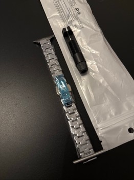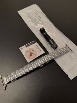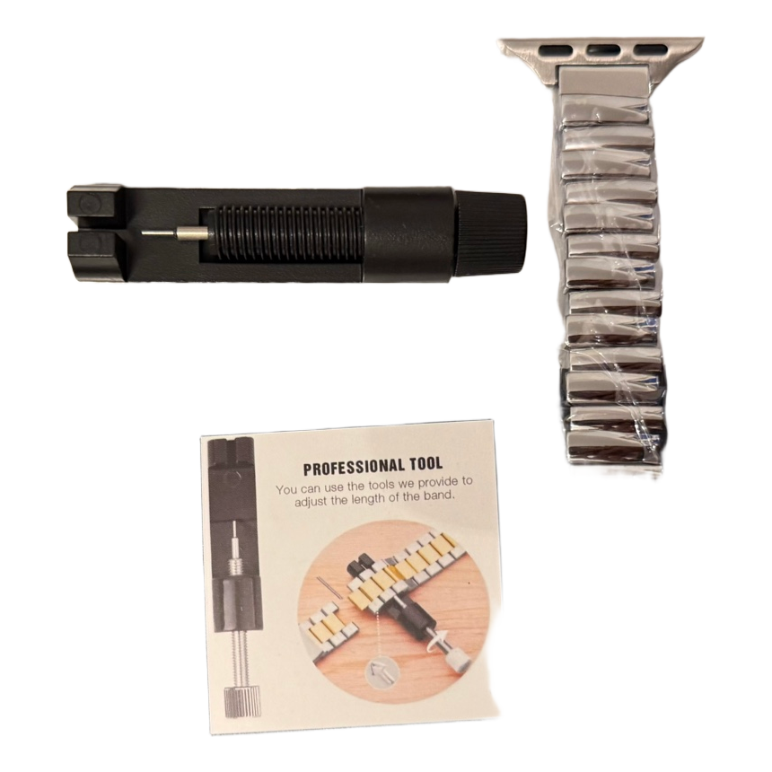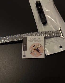 Metal watch replacement band for smartwatch. Comes with an adjustment tool.