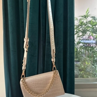 Kompakti kroko-kuvioitu laukku kullanvärisellä ketjulla. Laukun sisäosissa muutama tahra, mutta muuten erinomaisessa kunnossa.