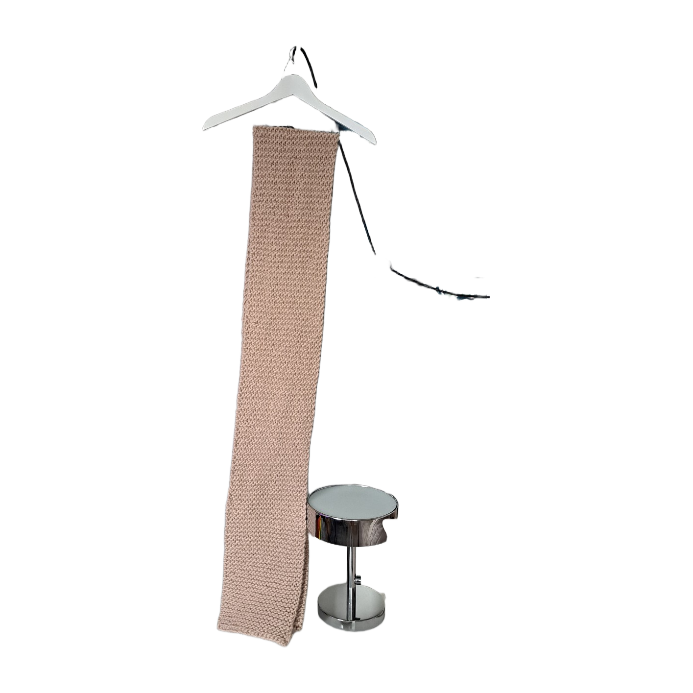 Pitkä lämmin beige neulehuivi, lämmin ja pehmeä materiaali. Itse neulottu ainaoikein-neuletta.