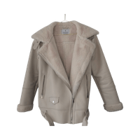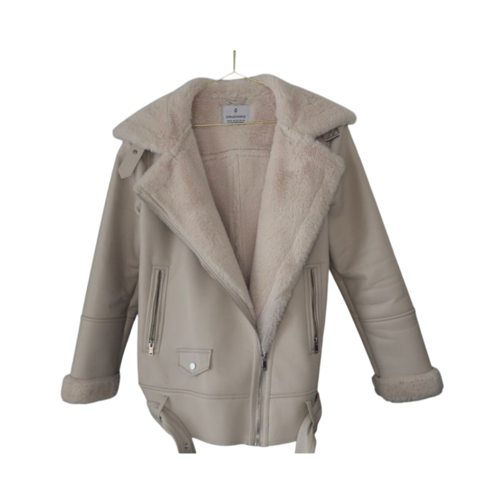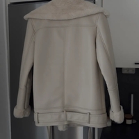 Lyhyt tekonahkainen takki pehmeällä vuorella. Takana hihassa on pieni korjattava sauma mutta se on helppo korjata ompelemalla.