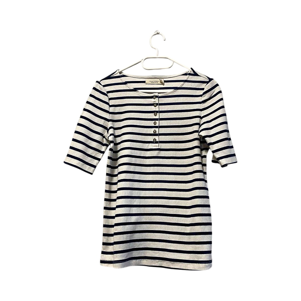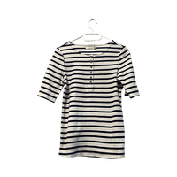 High-quality and timeless Seasalt Cornwall striped top in a classic nautical style. Made from soft organic cotton with a touch of stretch, offering comfort and breathability. Features half-length sleeves and a buttoned neckline detail that adds a subtle feminine touch. Easy to style for everyday wear with jeans, trousers, or skirts.